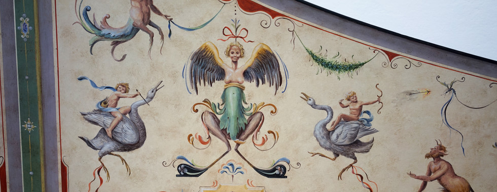 *Grottesca style decoration originated in Rome in the Augustan era (63 BC - 14 AD) and was lost for centuries until it was rediscovered and brought to prominence by decorative artists towards the end of the 1400s. This style of decoration is characterized by the depiction of fantastic and mythical beings, such as chimeras, winged genies, satyrs and sphinxes, often portrayed as slender and supple figures, which merge nonsensically with geometric and naturalistic decorations. The layout of the ornament usually respects a loose symmetry and the figures fill the space in a lively manner, generally on a white or monochrome background. Traditionally, Grottesca decoration is colorful combination of figures, branches, draperies, frames, geometric effects, and perspectives of architectural views. This type of decoration almost always has a certain lightness and airiness, due to the conscious use of negative space in the composition, and the the fact that subjects are generally executed with a lively almost calligraphic brushstroke.