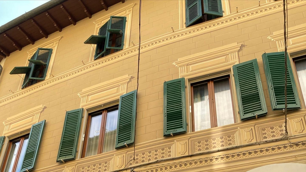 In February of 2022 My daughter Sonia and I started a large project to paint the facade of a building in the old centre of Pistoia, in via dei Fabbri. We were re-creating the decoration which had almost completely worn away. The owners had decided to take advantage of an Italian government funding scheme designated for the restoration of building facades visible to the public. The building in question houses a popular hardware shop on the ground floor, and residential apartments on the two floors above.